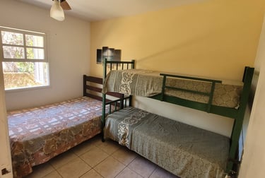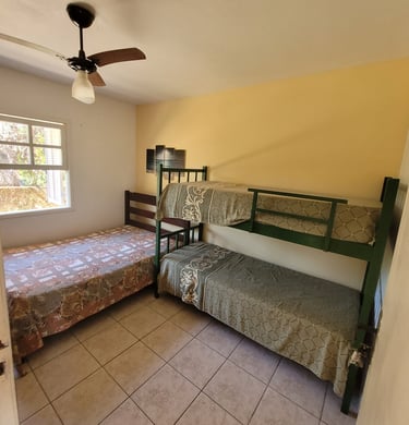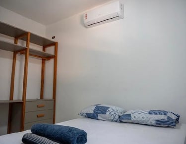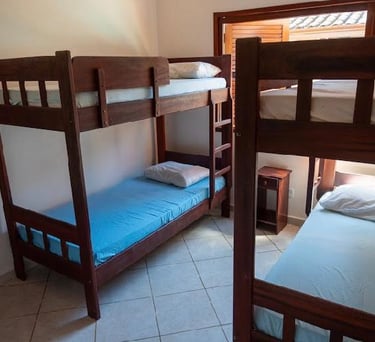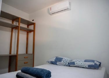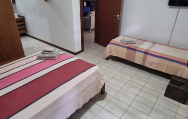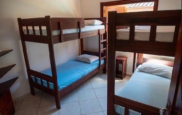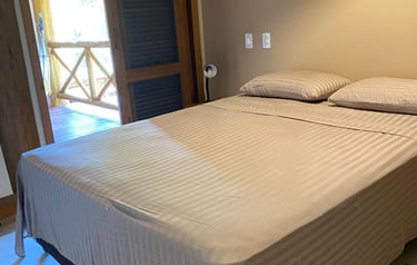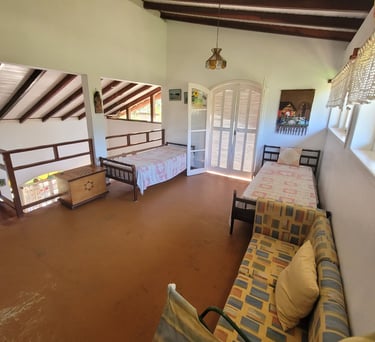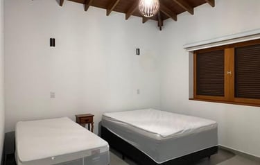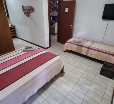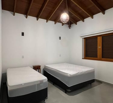 São 4 suítes todas com ar condicionado Suite 1 (Térreo) - 1 cama Queen Suite 2 ( superior)- 1 cama Queen Suite 3 ( superior) 1 cama Queen / 1 cama de solteiro com auxiliar . Suite 4 ( superior) 1 cama King / 1 sofá cama. Também disponibilizo 3 colchões caso necessário
